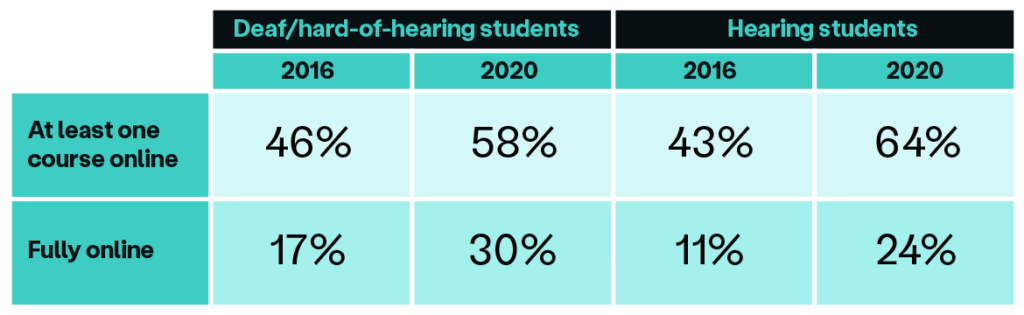 Table 2: Online learning among Deaf/hard-of-hearing and hearing undergraduate students in the U.S. (National Center for Education Statistics)
