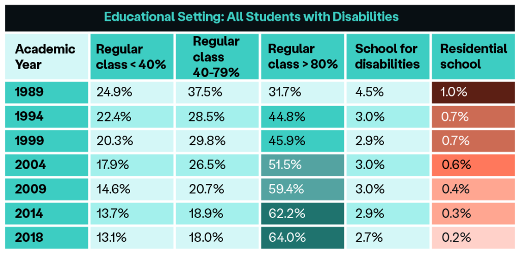 Between 1989 and 2018, data from the National Center for Education Statistics tracked enrollment of students with disabilities collectively — not by specific type of disability — and shows enrollment in residential schools dropped by 80% while the number of students getting the majority of their educational instruction in a mainstream classroom more than doubled