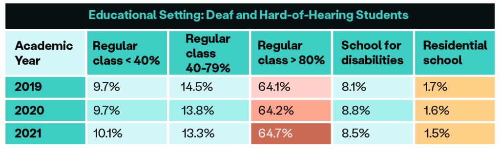 It’s worth noting that the rate of DHH enrollment in separate, non-residential schools for students with disabilities increased for the 2020 and 2021 academic years, coinciding with the pandemic when many mainstream schools transitioned to remote learning. Those virtual learning scenarios demand innovative approaches to accessibility.